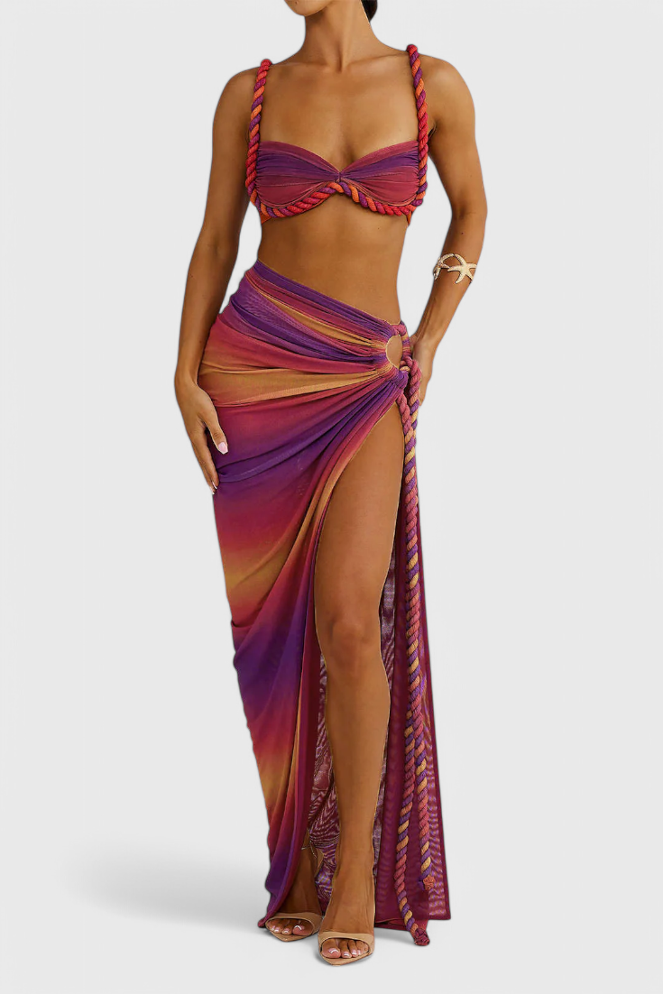 Vibrante y llamativo, este conjunto de falda está diseñado para destacar con su suave chiffon plisado, delicada bordado y soñados tonos en degradado. Ofrece una sensación ligera y aireada que se mueve maravillosamente contigo. Perfecto para salidas de primavera, vacaciones o eventos bajo el sol.